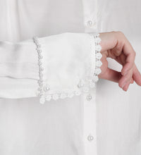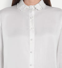 Featuring a distinctive double collar and elegant pearl buttons. The relaxed drop shoulder fit provides all-day comfort, while subtle lace detailing and pearl accents at the cuffs add a refined finishing touch.