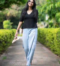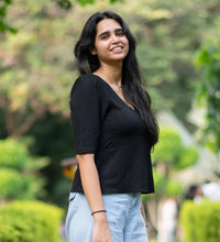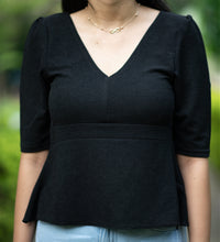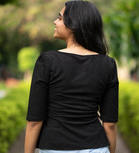 Designed for clean elegance, this black top features a structured bodice and soft puff sleeves for a subtle feminine silhouette.