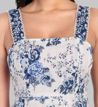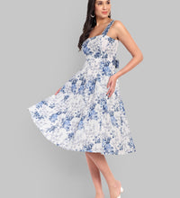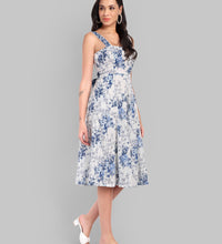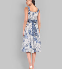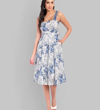 Crafted from 100% cotton, this midi dress showcases an elegant blue floral print and a kali-panel flare skirt for natural volume.