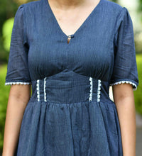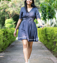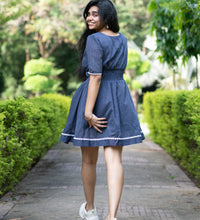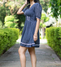 Make a graceful statement with this chic navy blue mini dress, thoughtfully crafted from breathable 100% cotton fabric.