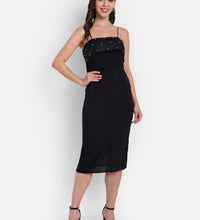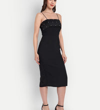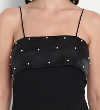 Featuring a sleek silhouette, this dress comes with delicate spaghetti straps and a structured bodice adorned with pearl-like embellishments with a back slit.