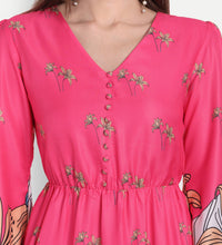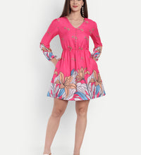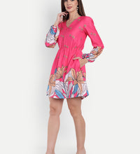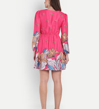 Make a bold statement in our Mini Dress which has a vibrant fuchsia base adorned with oversized floral prints.