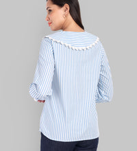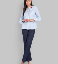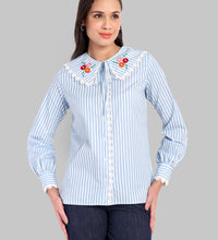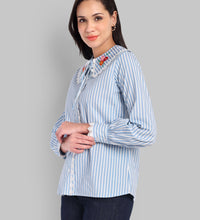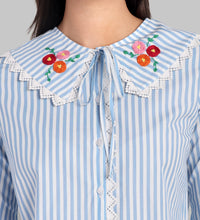 A modern impression with classic charm—this 100% cotton striped shirt features a wide statement collar enriched with floral hand embroidery and fine lace.